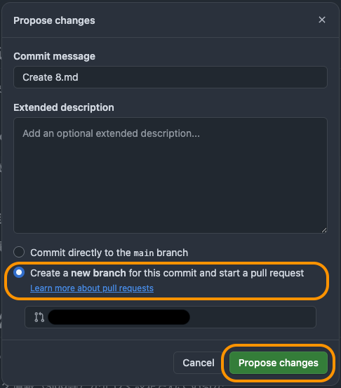 • ラジオボタンの「Create a new branch for this commit and start a pull request」を選択します(必須)