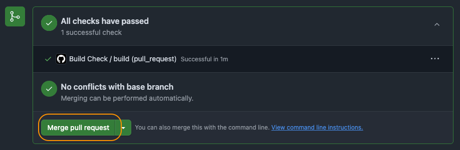 ビルドに成功した場合は下記の表示となり、マージが可能です。マージが完了されると自動デプロイが実行され、数分後に本番環境に適用されます。