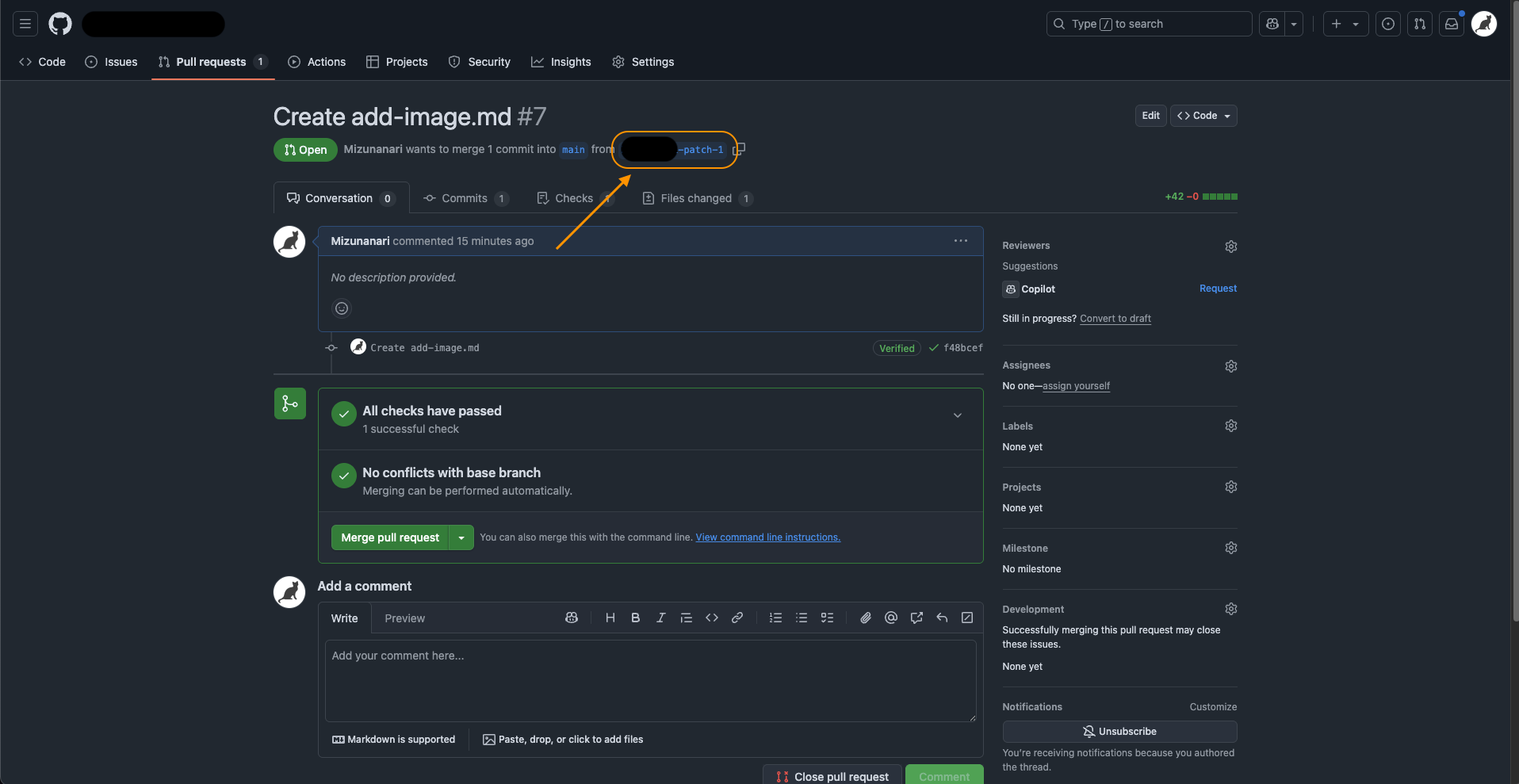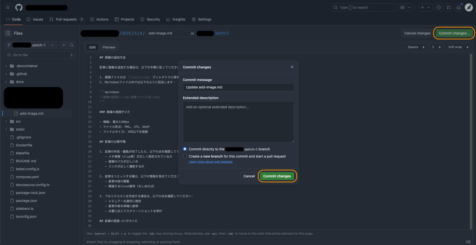 プルリクエストを作成します。これは本番環境のドキュメントに新たに記事を追加する申請のようなものです。他の人にレビューをしてもらう場合は、タイトルと説明を記載することをお勧めします。