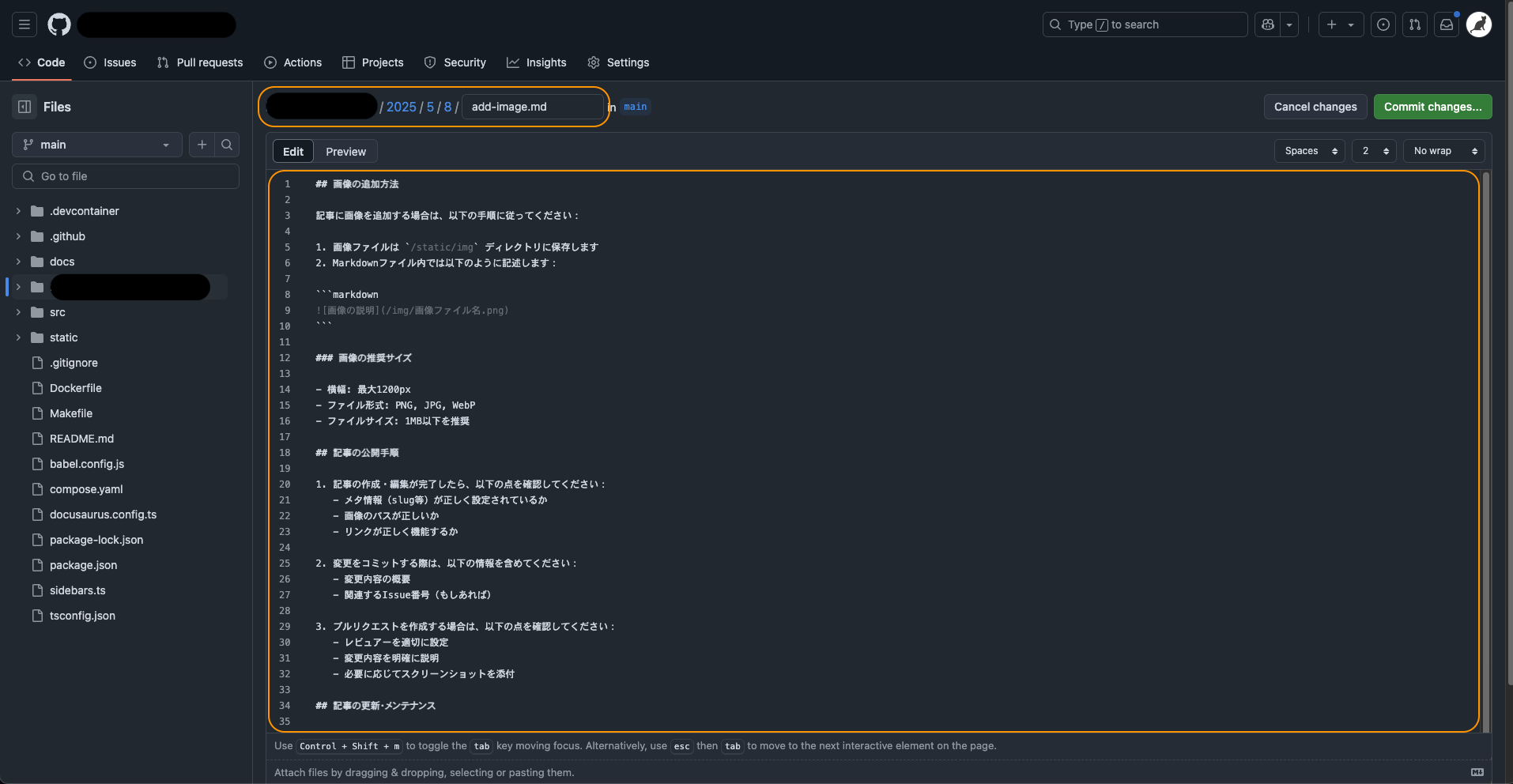 本文の記入が終わったら、「Preview」で記事を確認します。問題なければ「Commit changes…」を選択します。